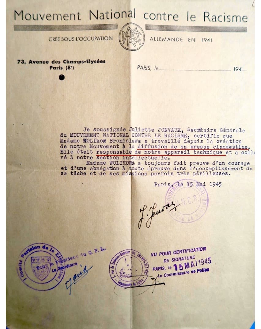 Certificat FFI-UJRE, émanant du groupe de combat de Lyon, du 15 sept. 1944, attestant de la qualité de résistante d’une agent de liaison depuis juillet 1940.