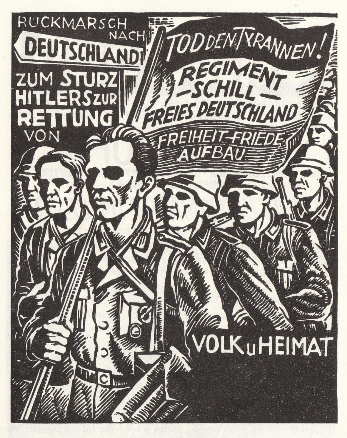 Tract du Travail Allemand (TA) où l’on peut lire « retour en Allemagne pour renverser Hitler et sauver le peuple » (en haut) et « Régiment Schill pour une Allemagne libre ».